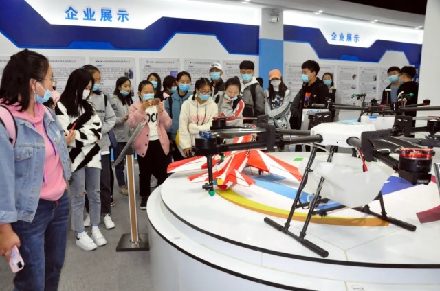 在子園區產品展廳,同學們被展臺上的多旋翼植保無人機、取苗機械手、栽植機械手等產品吸引了注意力,紛紛拿起手機對著展臺拍起照來。子園區河南科技大學·大學科技園工作人員介紹了河科大師生創新企業、團隊的研發成果及市場應用情況,同學們聽后連連贊嘆。